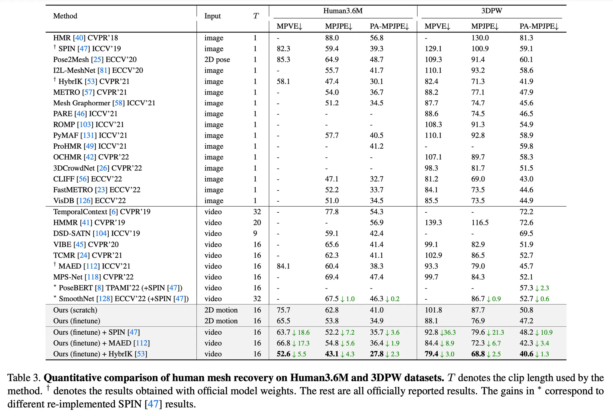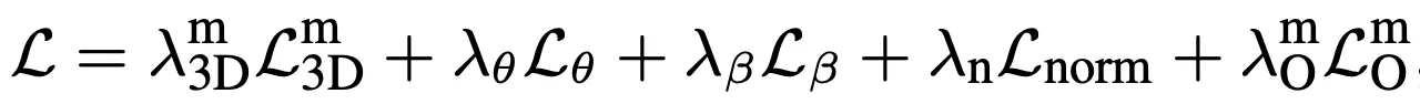 Human Mesh Recovery task를 위해 SMPL을 사용함. 각 프레임에 대한 pose 파라미터를 얻기 위해 motion embedding을 hidden layer가 포함된 MLP의 입력으로 하여 포즈 파라미터 를 얻으며, shape 파라미터를 얻기 위해 temporal dimension에 걸쳐 average pooling을 진행한 후 또 다른 MLP의 입력으로 해서 shape 파라미터 를 얻음. 이때의 loss는 아래와 같음