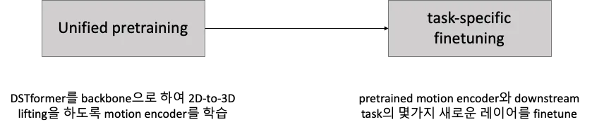 두 번째 문제를 해결하기 위해서는 2D 스켈레톤이 다양한 종류의 모션 데이터에 대한 보편적인 역할을 수행할 수 있다는 점을 활용함. unified pretraining을 위해 in-the-wild RGB 비디오 데이터로부터 2D를 3D로 lifting함. 이때는 2D reprojection loss를 사용함