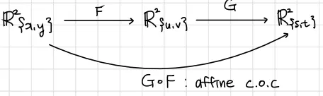 아핀 좌표변환(affine change of coordinate)은 합성도 가능하다. 즉 아핀(affine)변환은 합성을 해도 아핀(affine)변환이다.