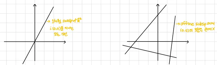 집합(set)의 관점에서 서로 같은 집합 와 에 대해 로 정의되고 아래 세가지 성질을 만족하는 공간을 아핀공간(Affine space)이라 한다.