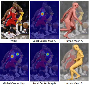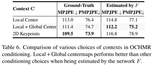 local centermap과 global centermap을 비교했을 때 global centermap이 겹치는 상황에서 더 좋은 영향을 주었음을 확인하였다. 흥미로운건 GT 2D keypoint를 활용했을 때 가장 높은 성능을 보였다는것이다. 그러나 GT keypoint를 사용할 수 없을 땐 centermap들을 활용하는게 더 높은 성능을 보였다.