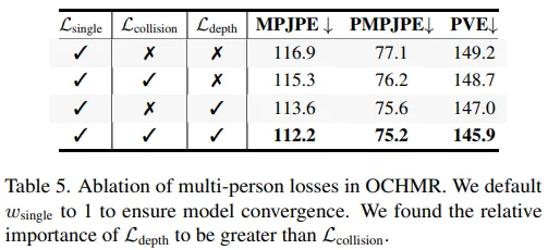 결과 표는 위와 같으며 이를 통해 두 손실함수를 모두 사용했을 때 가장 좋은 성능을 보임을 확인했으나 보다 가 좀 더 영향을 미침을 확인하였다. 또한 multi-person losses 사용하지 않은 손실함수()만을 사용해도 SPIN보다는 성능이 좋게 나왔다.