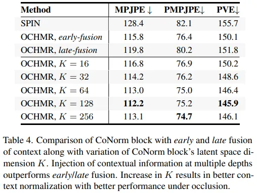 early fusion에선 channel-wise concat을 통해 입력이미지, global centermap, local centermap을 합쳤다. late fusion에선 세번째 ResNet block 후 다운샘플링된 context information인 중간 feature를 합쳤다. 본 실험에서 CoNorm block 형식의 여러 깊이에서의 고해상도 context information을 넣는것이 겹치는 이미지에서 정확한 사람의 메쉬를 추정하는데 중요한 역할을 함을 확인하였다. 또한 본 연구에선 OCHMR을 백본으로 사용했을 때 4개의 CoNorm 블록에서 잠재공간(latent space)의 차원 를 다양하게 설정하여 실험을 진행했다. K가 증가할 수록 SPIN 모델과 비교하여 성능이 증가하는 것을 확인했으며 모델의 정확도와 오버헤드를 고려하여 일 때 균형있는 성능을 확보할 수 있음을 확인하였다.
