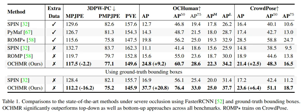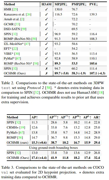 General benchmark 본 연구에선 3DPW와 같은 자주 쓰이는 벤치마크 데이터셋에서도 평가를 진행하였다. OCHMR은 겹치지 않는 이미지에서도 큰 성능 하락이 없다. 오히려 SPIN의 MPJPE 오류와 비교했을 때 5mm 정도의 성능 향상을 보였다. 별도의 추가 데이터 학습 없이 본 모델은 ResNet-50을 백본으로 사용하는 ROMP와는 유사한 성능을 보였다. 또한 COCO 데이터셋에서도 좋은 성능을 보임을 확인했다.