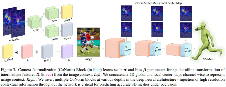 본 연구에선 이러한 문제를 해결하기 위해 현재 존재하는 feature 추출용 backbone에 쉽게 적용할 수있는 Context Normalization(CoNorm) block을 소개한다. CoNorm이 conditioning 입력 C를 사용하여 중간 feature map의 정규화를 할 수 있도록 하는것이 핵심 아이디어이다. 딥러닝 모델 P는 입력이미지 I로 부터 여러 메쉬를 예측하기 위한 contextual information을 이용하기 위해 CoNorm block을 사용한다. 배치정규화와 유사하게 CoNorm은 을 기반으로 한 네트워크의 중간 feature에 아핀변환(affine transformation)을 적용하여 신경망의 출력에 영향을 주기 위해 학습시킨다.