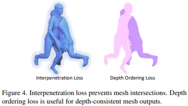 여러사람이 있는 이미지에서 모델 는 겹치거나 일관되지 않은 깊이값 순서(depth ordering)의 메쉬를 추정하곤 한다. 이를 해결하기 위해 본 연구에선 두가지 multi-person losses를 사용하였다. 이는 아래 그림과 같은 interpenetration loss와 depth-ordering loss에 해당한다.