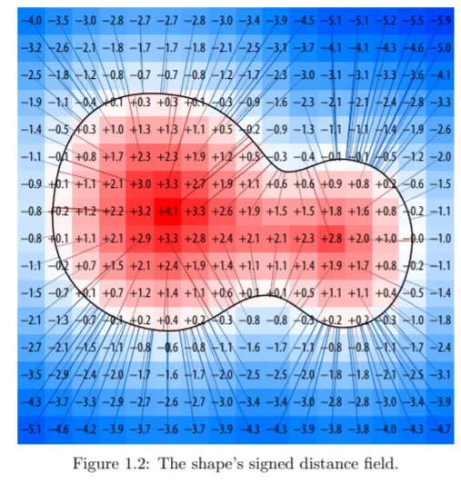 Interpenetration Loss. 를 3차원 공간에서 Signed Distance Field(SDF)를 수정한 값이라고 하자. SDF는 내부는 외부는 로 그리고 edge에 갈 수록 에 가깝게 되는 거리함수이다. 가령 아래그림와 같은 상황이라고 가정하자.