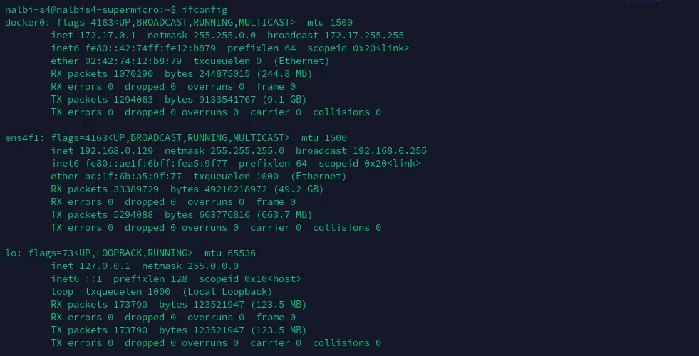 아래 명령어를 통해 현재 설정 되어있는 ip 주소와 랜카드 식별자(ens4f1)을 확인합니다.