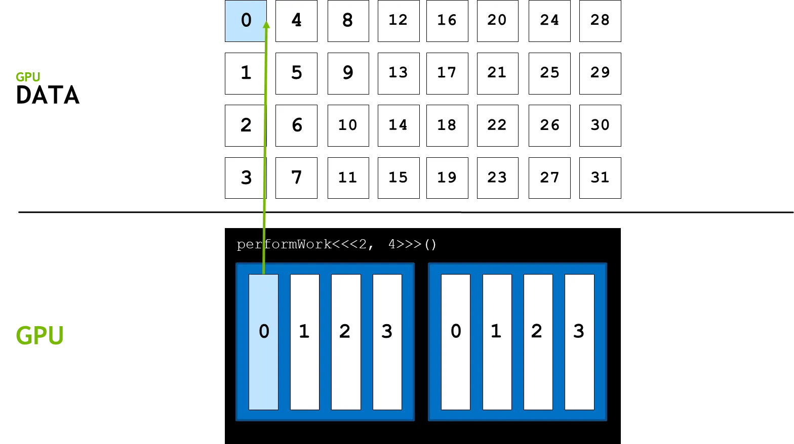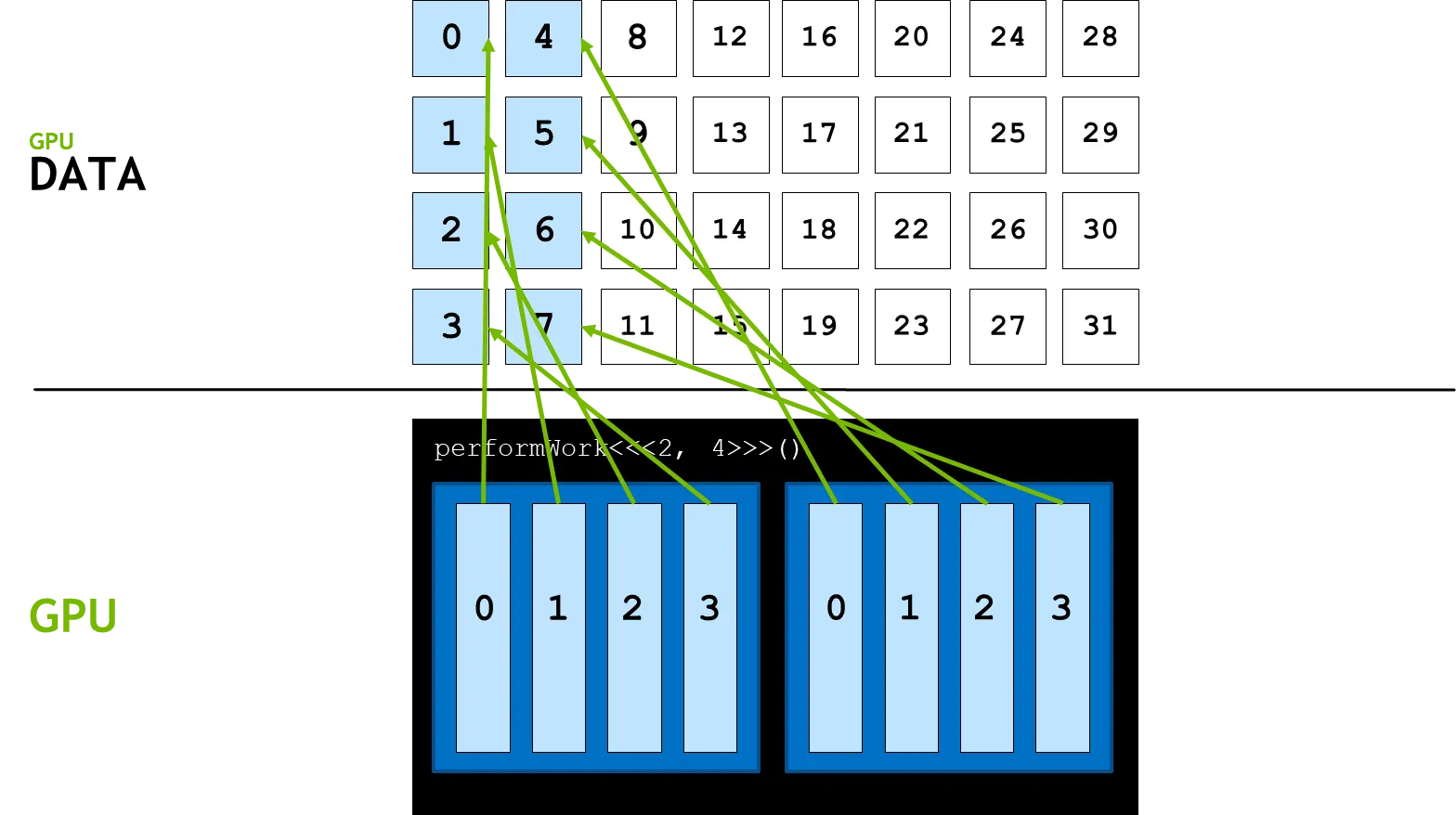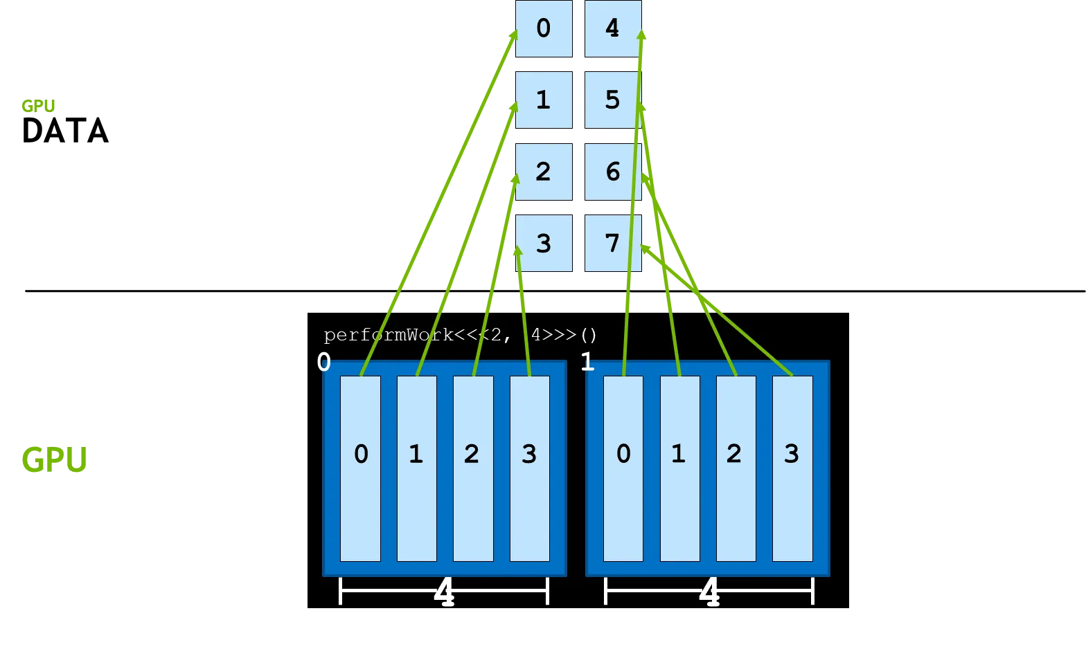 이는 입력값을 배치단위로 처리하며 각 배치는 병렬적으로 연산된다. CUDA는 여러개의 블록을 병렬적으로 한번에 사용할 수 있다. 따라서 grid-stride loops를 활용하면 커널은 쓰레드보다 훨씬 큰 데이터도 빠르게 처리할 수 있다.