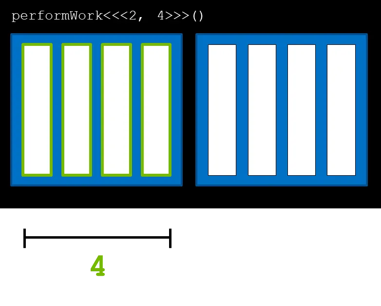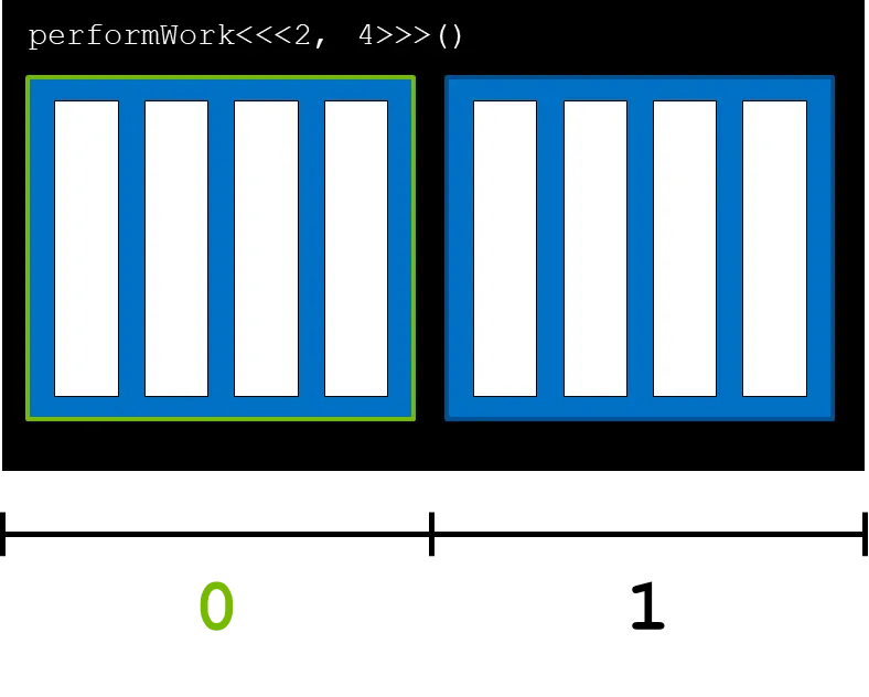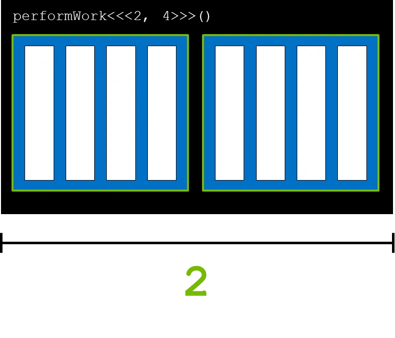 이번엔 블록(block)에 대해 알아보자. 블록은 위 그림에서 초록색으로 표시된 파란 블록을 의미한다. 블록은 여러개의 쓰레드를 구성하는 단위이며 위 그림에선 4개의 쓰레드로 이루어진 2개의 블록이 존재한다.