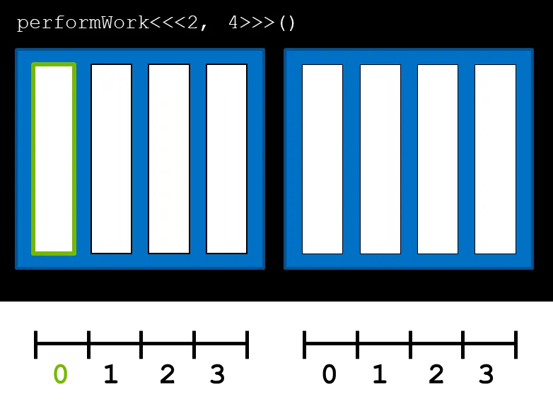 threadIdx.x는 블록 안에 있는 쓰레드의 인덱스를 의미한다. 0번 쓰레드는 아래 그림과 같다.