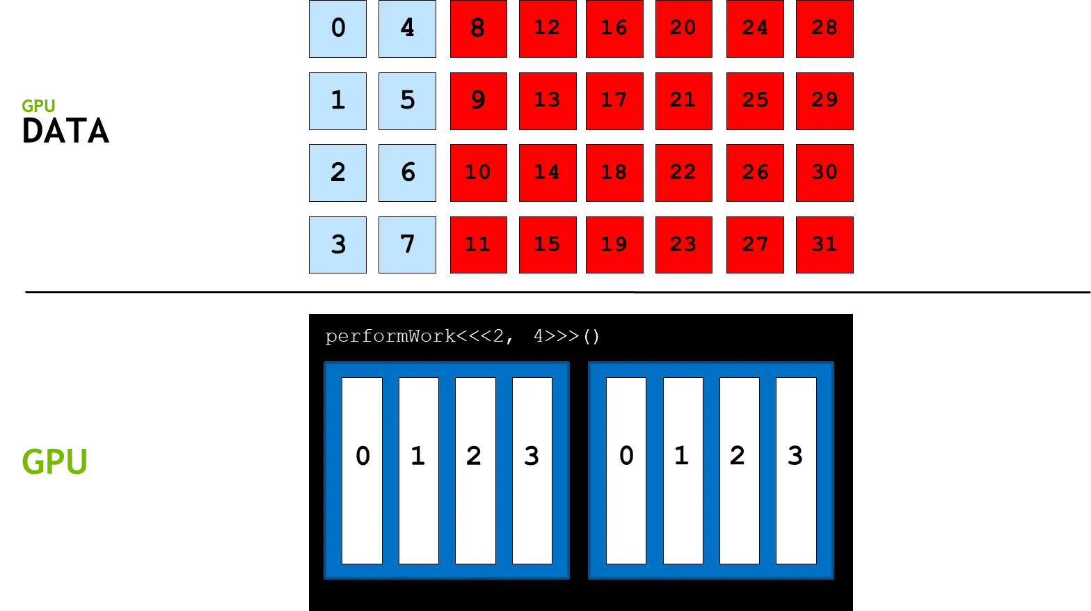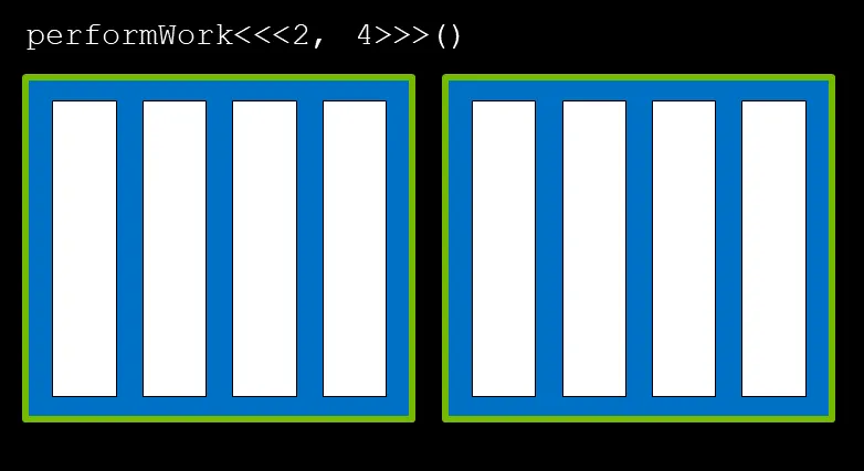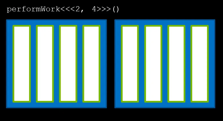 위 와 같은 GPU함수(performWork)를 커널(kernel)이라고 부른다. 커널은 앞에서 선언한 것 처럼 꺽쇠를 통해 선언한대로 블록수와 쓰레드수를 구성하여 실행된다. 또한 모든 블록은 같은 쓰레드 수를 갖는다.