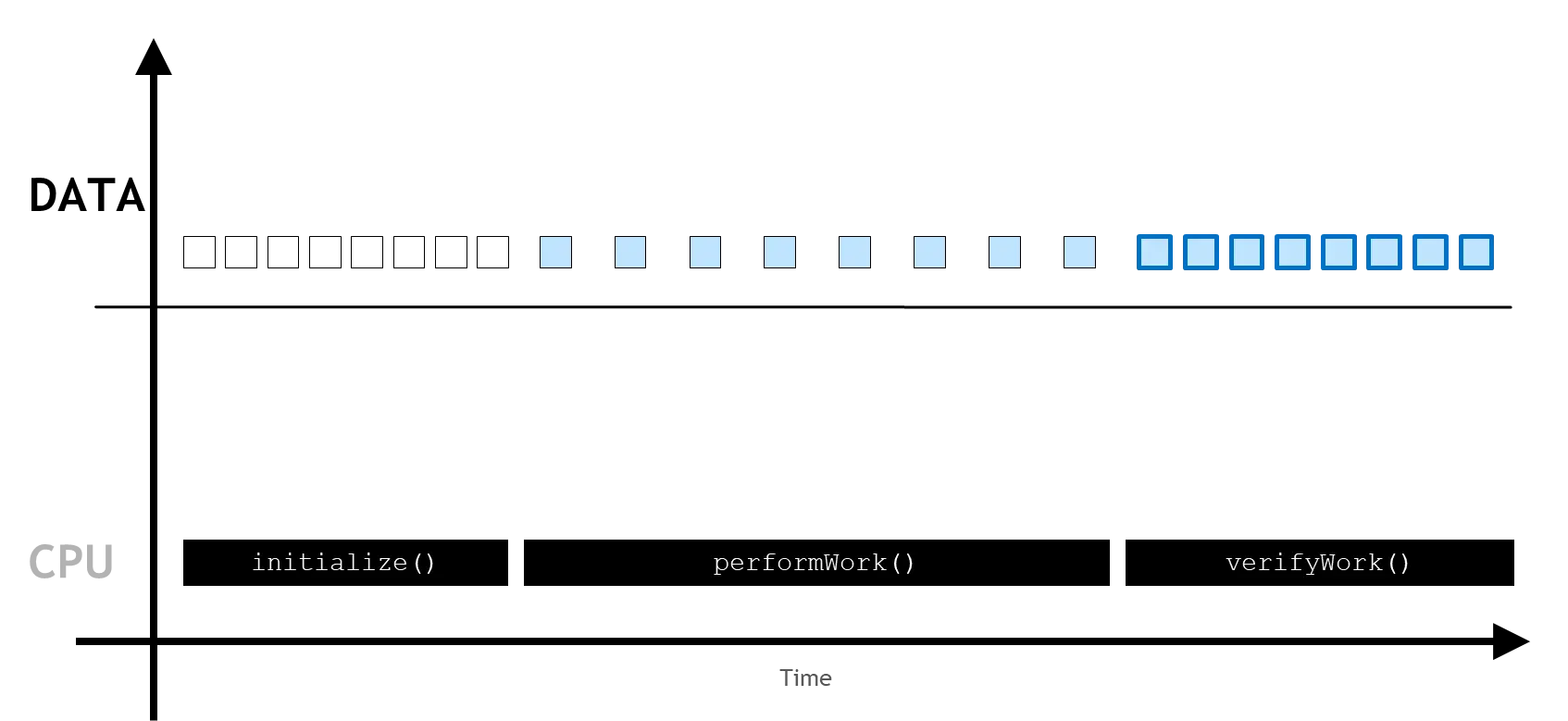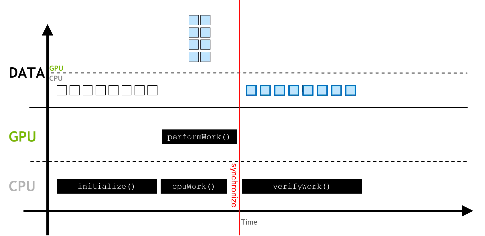 먼저 어플리케이션은 데이터를 CPU(정확히는 RAM)에 할당하는 initialize를 진행한다. 그리고 이를 이용하여 연산하는 과정인 performWork을 CPU에서 거친다. 연산이 끝나면 결과를 저장하고 확인하는 과정 verifyWork를 진행한다. 이 모든 연산은 위 그림과 같이 전부 CPU단에서 처리되게 된다.