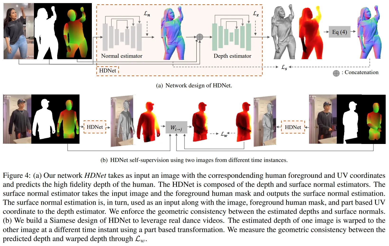 본 연구에서는 HDNet(Human Depth Neural Networks)라는 실제 비디오와 스캔데이터를 활용하는 네트워크를 제안하였다. HDNet은 surface normal estimators와 depth estimators 로 두 개의 estimator로 구성되어있다. surface normal estimators는 RGB영상과 휴먼 마스크를 입력으로 받아 surface normal을 출력한다. 그리고 depth estimators는 RGB이미지, 휴먼 마스크, 그리고 UV 좌표값을 받아 depth값을 출력한다.