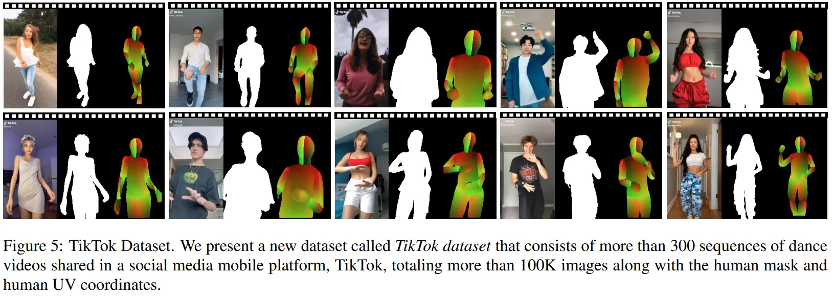 여느 3D 관련 분야들과 같이 옷을 입은 사람에 대한 학습 문제에서 가장 큰 이슈 중 하나는 데이터가 부족하다는 것이다. 게다가 현재 있는 데이터들도 다양한 포즈나, 외형, 그리고 옷의 복잡한 모양을 포함하지 않는다. 본 연구에서는 소셜미디어에 공유된 수백만의 댄스 동영상을 활용하여 옷입은 사람의 3D를 단일 카메라로 부터 depth와 surface normals의 형태를 이용하여 높은 정확도로 데이터를 구성하는 새로운 방법을 제시하였다. 이 댄스 동영상의 특징은 아래와 같다.