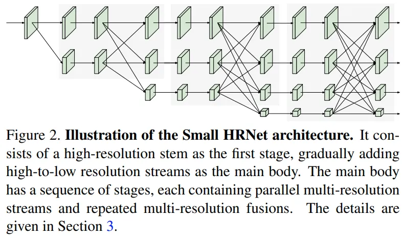 HRNet은 첫번째 단계에서 high-resolution의 컨볼루션 stem으로 시작하여 새로운 단계로써 high-resolution의 steam을 하나씩 추가하는 방식으로 설계되어 있다. 각 단계에서 resolution간의 정보가 반복적으로 교환된다. 본 연구에서는 Small HRNet 디자인을 따랐고 본 네트워크에 몇개의 레이어를 활용하였다. Small HRNet의 레이어 구조는 아래와 같다.