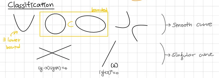 차원이 이라면 유한개의 점을 의미하고 차원이 이라면 곡선(curve)을 의미하며 곡선(curve)엔 직선(line), 타원곡선(elliptic curve) 등이 있다. 타원곡선(elliptic curve)는 아래 그림과 같이 분류된다.