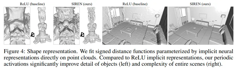 implicit problem에서 가장 많이 활용하는 방식은 ReLU 기반의 MLPs 모델인데 ReLU의 경우 piecewise linear하기 때문에 이계도 함수가 0이라는 문제를 가지며 결국 신호를 처리할 때 좀 더 세세한 정보를 표현할 순 없게 된다. 하이퍼볼릭탄젠트(tanh)나 소프트플러스(softplus) 함수를 기반으로 할 경우 고차원의 미분를 진행할 수 있기 때문에 이러한 문제는 사라지지만 실제 적용했을 때 낮은 성능을 보이는 문제가 있다. 이에 따라 본 연구에서는 사인커브 기반의 방식을 적용하여 높은 성능을 내는 방식을 제안했다.