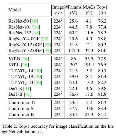 유사한 파라미터 수와 컴퓨터 자원 하에 Conformer는 CNN과 ViT보다 좋은 성능을 보였다. 단순히 성능을 넘어 Conformer는 ViT보다 빠르다.