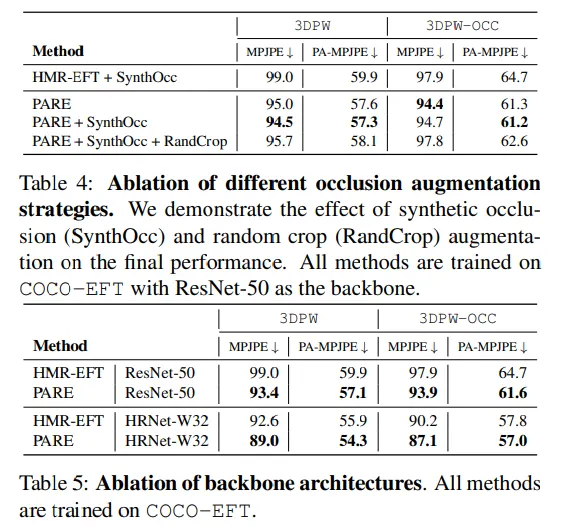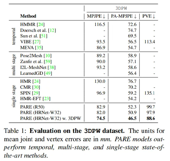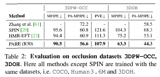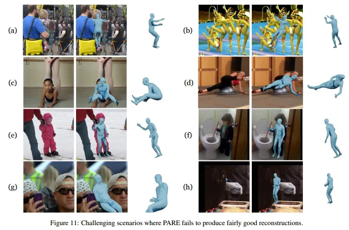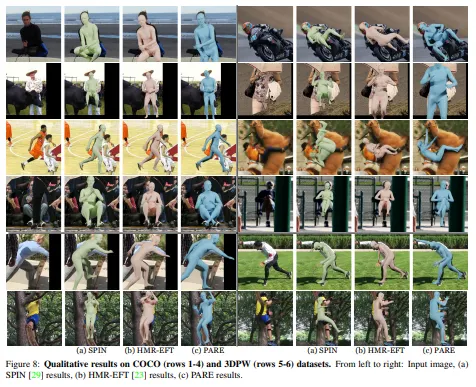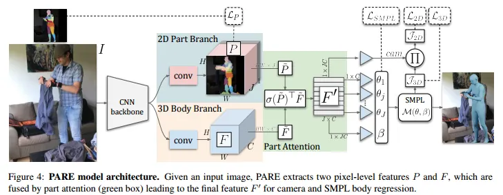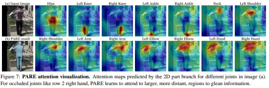 본 연구에서는 새로운 Part Attention Regressor인 PARE를 제안하여 각 독립적인 바디파츠의 가시성에 대한 정보를 표현하므로써 occlusion에 강건함을 얻었다. 특히 바디파츠가 보이지 않았을 때 보이는 부분에 의존하므로써 이러한 부분을 커버하였다.