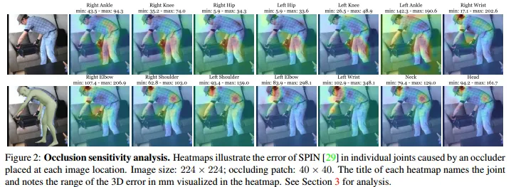 Error heatmap을 이용하여 시각화 진행. gt값과 추정한 joint 사이의 유클리디언 거리를 계산함. 각 pixel에 대해 occluder가 해당픽셀에 있을 때 error를 계산. occluder(occlusion을 만들어줌)는 회색 마스크로 이미지 사이즈: 224x224에 패치를 40x40으로 설정함