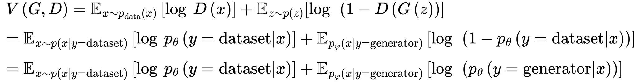 는 노이즈분포를 데이터 공간으로 매핑시키며 는 입력이미지가 원본일 확률을 구하며 는 위 손실함수를 최소화하도록, 는 최대화 하도록 하는 파라미터를 학습시키며 이에 따라 최적화 함수는 아래와 같이 정리됨
