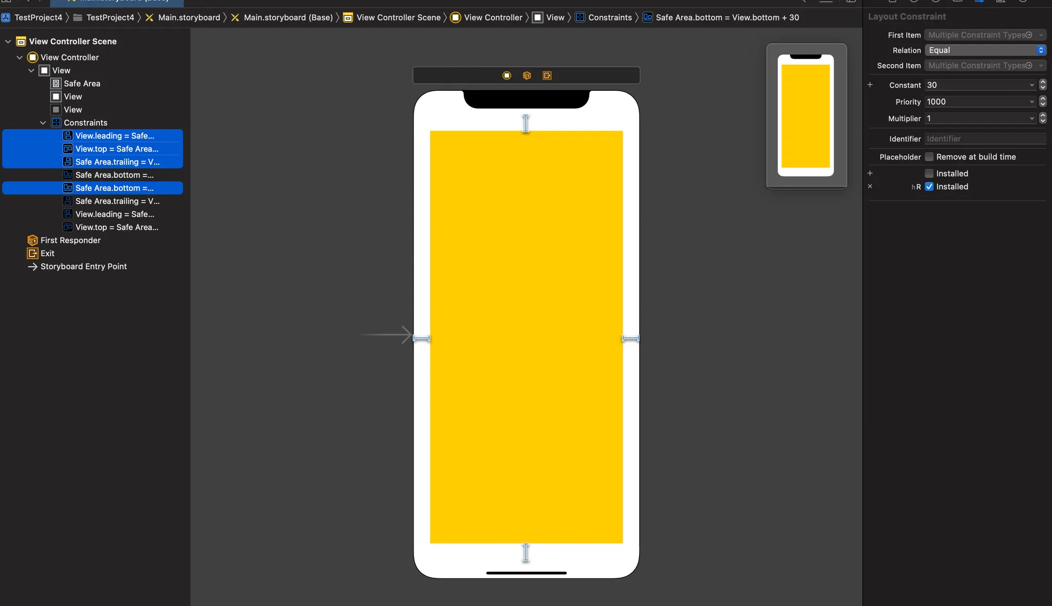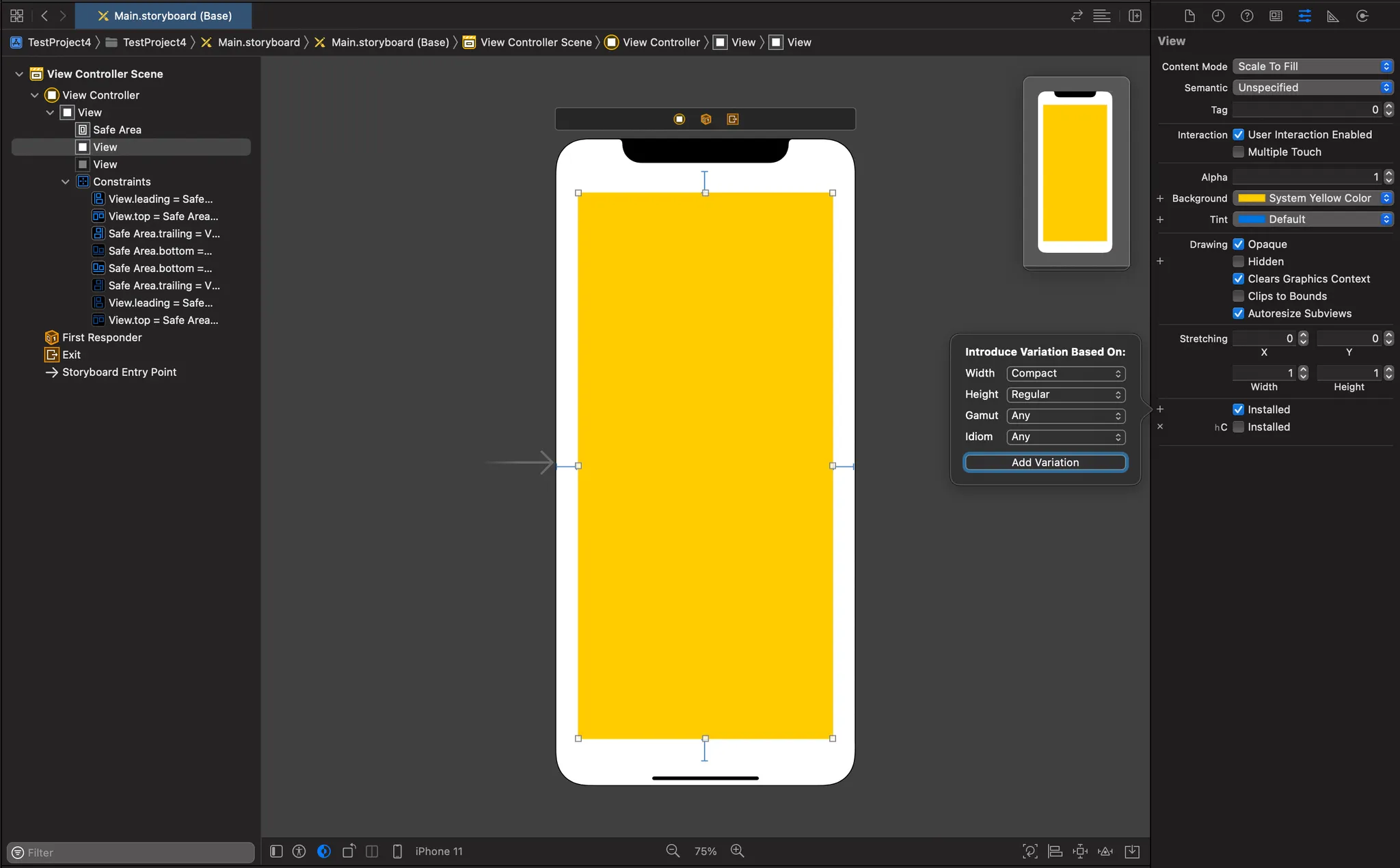 Constraints 경우에도 Portrait 화면에서만 적용하도록 Attribute Inspector의 Introduce Variation Based On 값을 HIG(Human Interface Guidelines)에 맞춰 적용할 수 있습니다.