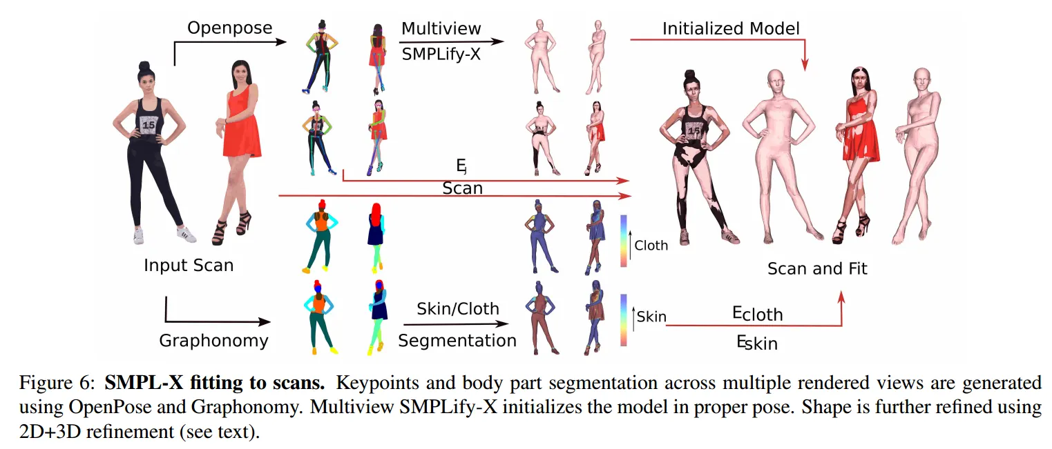 스캔데이터의 피부부분과 옷 부분을 구분하기 위해 본 연구에서는 Graphonomy 모델을 이용하여 스캔데이터를 피부부분과 옷 부분을 라벨링하였다. 본 연구에선 과 뿐 만 아니라 2D landmark에 대한 손실값 를 통해 projection된 키포인트와 정답 키포인트 사이의 차이를 반영하여 다중카메라에 대해 SMPL-X 파라미터를 피팅하였다. 이 과정의 전체 파이프라인은 아래 그림과 같다.