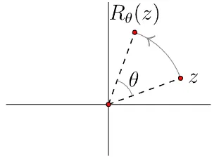 위 변환은 평면위의 점을 원점(origin)에 대해 각 만큼 회전시킨다(은 반시계방향이고 이면 시계방향이다). 이러한 경우를 보기위해 라 하고 아래와 같이 쓸 수 있다.