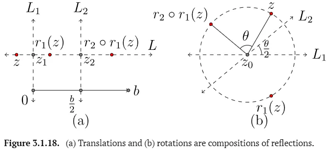 예를들어 직선 에 대한 반사(reflection)는 먼저 만큼 수직으로 이동(translate)하고 만큼 회전하고 실수축에 대칭한 후 만큼 회전한 후에 마지막으로 만큼 이동(translate)한다. 정리하면 아래와 같다.