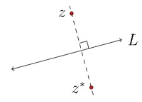 복소공간에서 직선 에 대해 반사(reflection)함수의 공식은 직선을 실수축에 대해 회전(rotation)과 이동(translation) 통해 변환하고 켤레를 취한 후 회전과 이동을 반대로 변환하면 만들 수 있다.