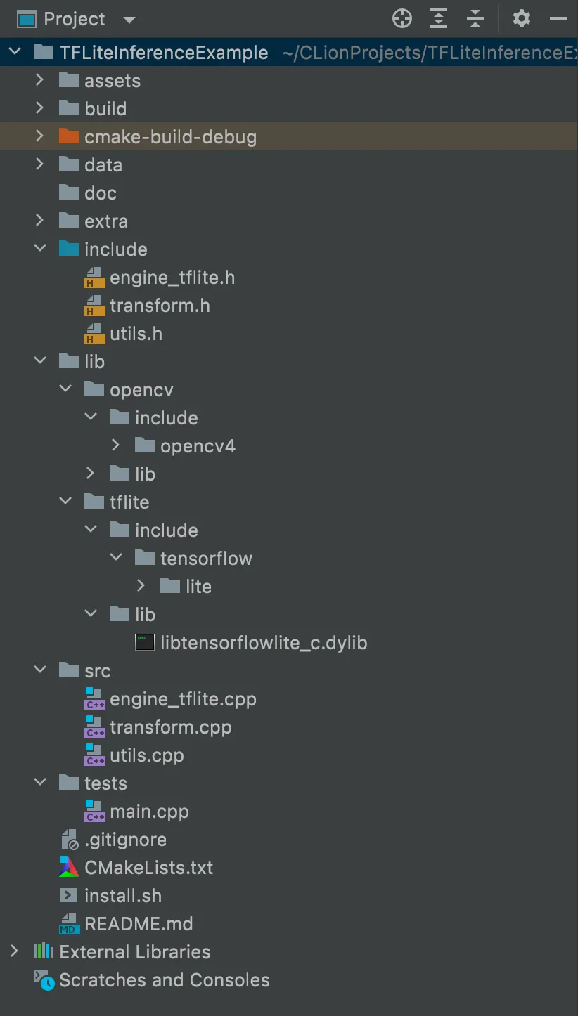 빌드가 완료되면 만들어진 라이브러리 파일(예시: tensorflowlite_c.dylib)을 적당한 위치(lib)에 이동하여 사용합니다. 라이브러리 파일은 OS 별로 확장자가 다르니 참고!