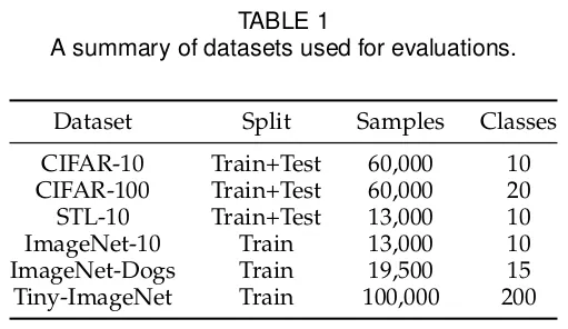 CIFAR-10, CIFAR-100, STL-10 데이터셋은 훈련셋과 테스트 셋 모두 활용했고 ImageNet-10, ImageNet-Dogs, Tiny-ImageNet은 훈련셋으로만 활용하였다. CIFAR-100은 GT값으로 100개 클래스가 아닌 슈퍼클래스 20개를 사용하였다. STL-10을 위해 해당 데이터셋의 100,000개의 라벨이 없는 샘플이 추가되어 ICH를 학습하기 위해 사용되었다.