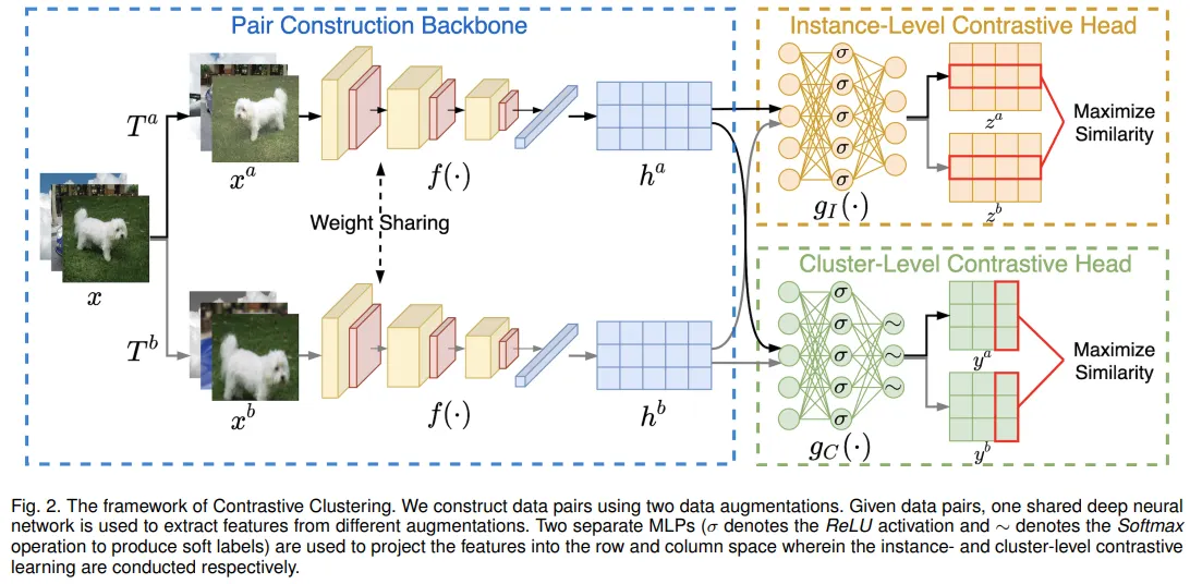 위 그림과 같이 본 연구의 모델은 세가지 컴포넌트로 구성되며 각각 pair construction backbone(PCB), instance-level contrastive head(ICH), cluster-level contrastive head(CCH)라 한다. 간단히, PCB는 데이터 어그멘테이션과 어그멘테이션된 샘플로 부터 추출한 피쳐 페어를 구성하며 이후 ICH와 CCH에 각각 피쳐매트릭스의 행렬 공간에 contrastive learning이 적용된다. 훈련 후에 CCH를 통해 쉽게 클러스터를 할당할 수 있다. 본 연구의 기본 아이디어는 dual contrastive learning이 피쳐매트릭스를 직접 구성할 수 있다는것이었으나 실험적으로 instance-level과 cluster-level의 contrastive lnearing을 독립된 서브스페이스에 분리함으로써 클러스터링 성능을 향상시켰음을 보였다. 본 현상의 원인은 분리전략이 ICH와 CCH의 표현능력을 향상시켰기 때문일 수 있다고 지적하였다.